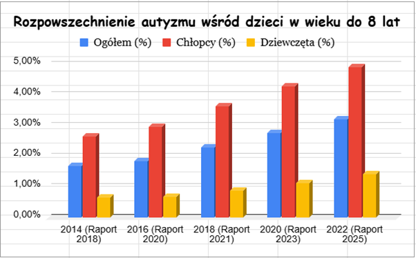 Obecnie u dzieci w wieku 8 lat diagnozuje się spektrum autyzmu u 1 na 31 osób, co stanowi 3,2% tej populacji. Odnotowywany stabilny trend wzrostowy nie wynika jedynie ze zwiększonej liczby przypadków, ale przede wszystkim z coraz bardziej precyzyjnych narzędzi diagnostycznych oraz wyższej świadomości społecznej.