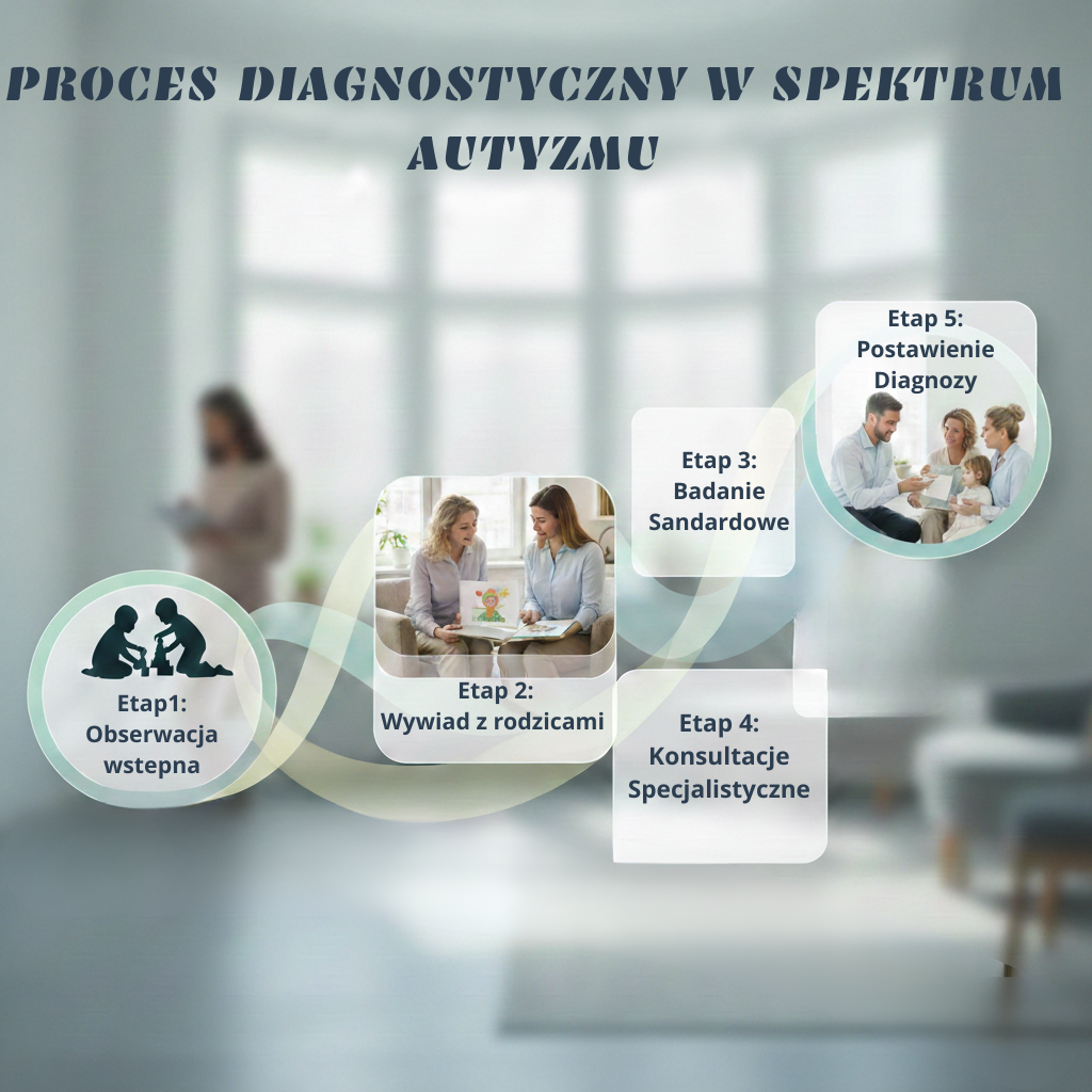 Proces diagnostyczny w spektrum autyzmu jest złożony i wieloetapowy, ponieważ nie opiera się na obiektywnych markerach biologicznych, lecz na drobiazgowej analizie zachowania i historii rozwoju. Standardowy model diagnostyczny obejmuje zazwyczaj od trzech do pięciu spotkań.